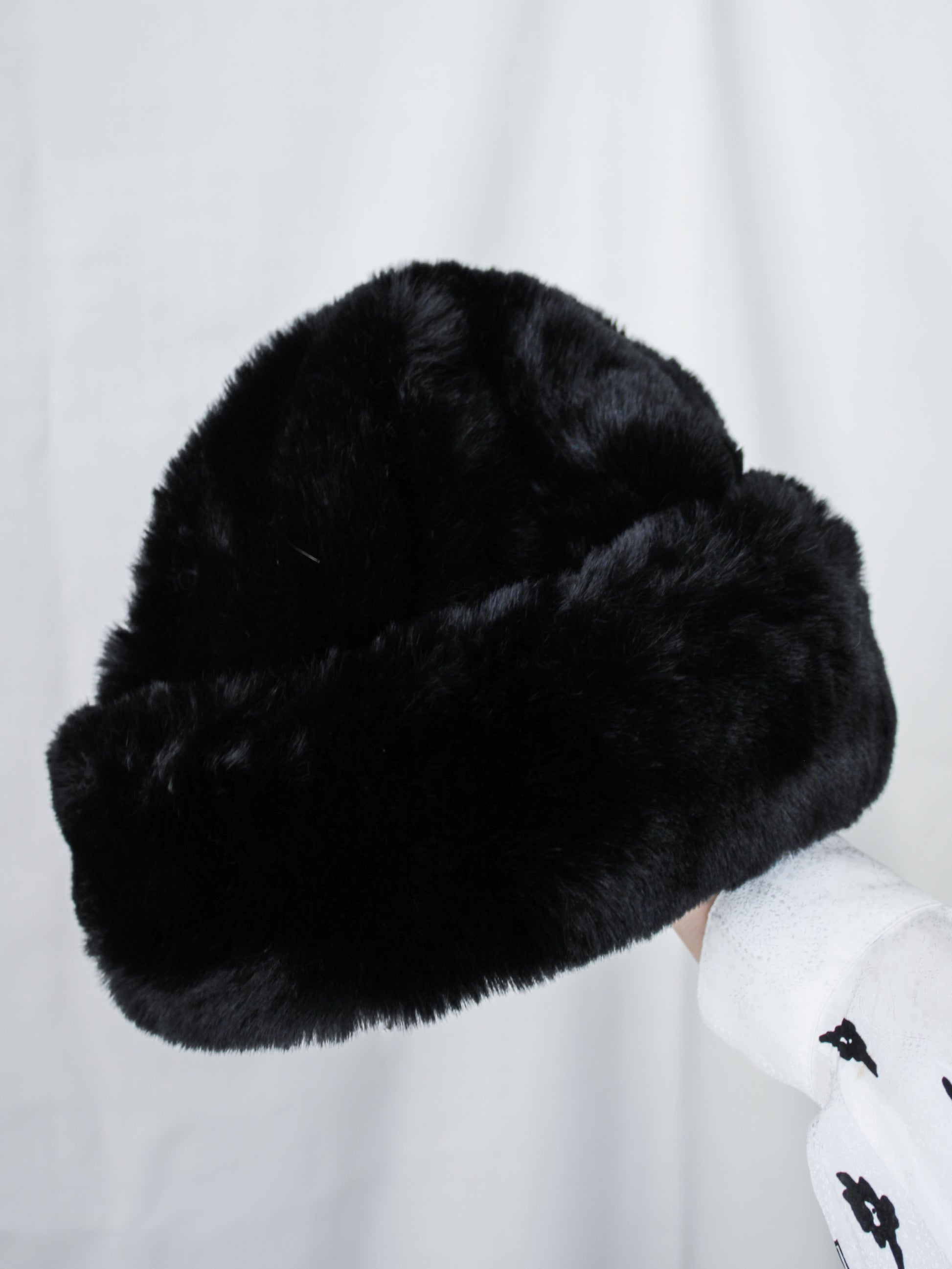 Gorgeous 1960's imitation black faux fur hat, rounded hat with fold up brim. Lightly quilted lining with adjustable elastic in the brim to make a better fit on the head.