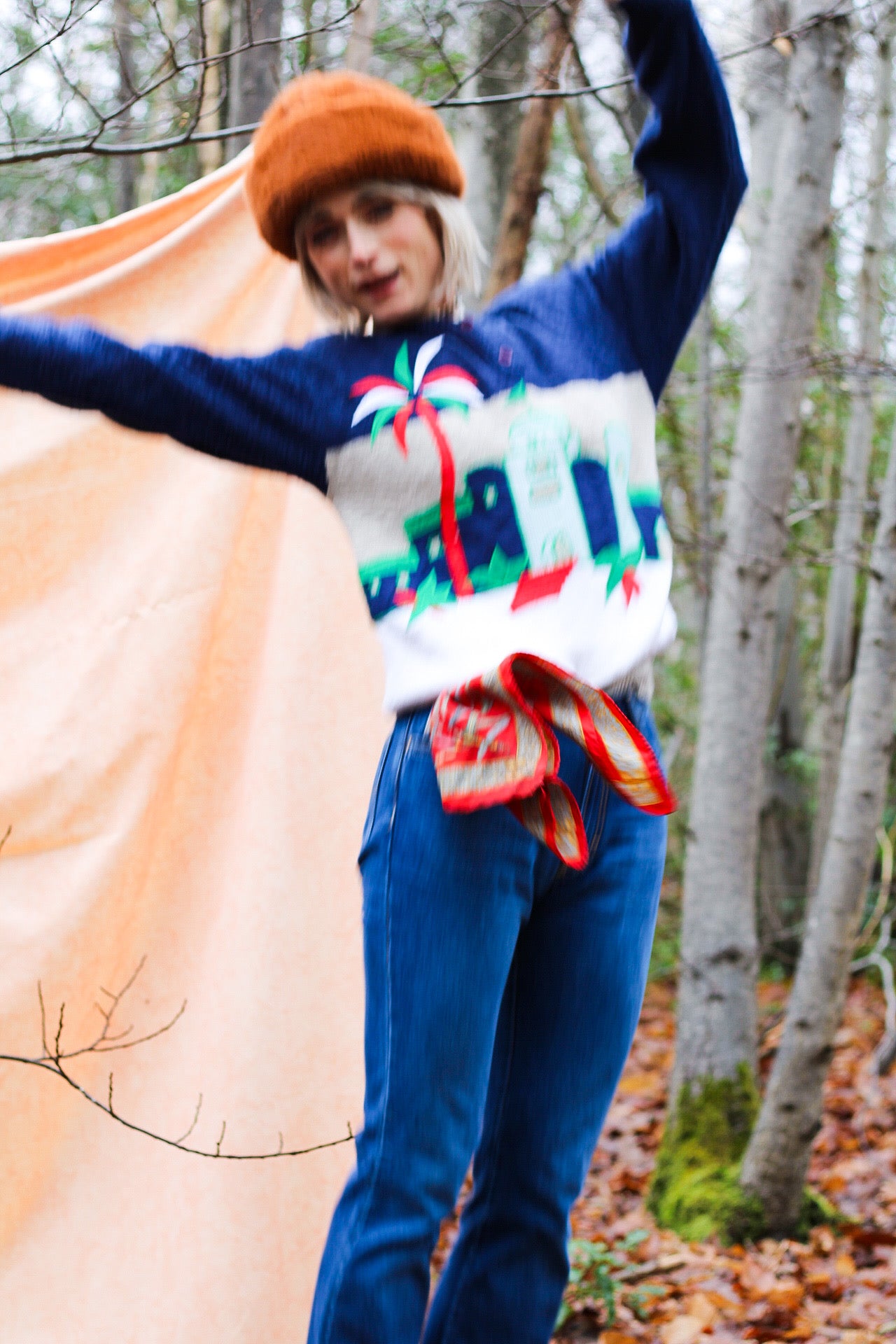 Adorable navy, beige and white light knitted sweater with lovely building and palm tree scene. Gorgeous red accents in the applique along with blues and greens. Button up neckline and light shoulder pads which can be removed.