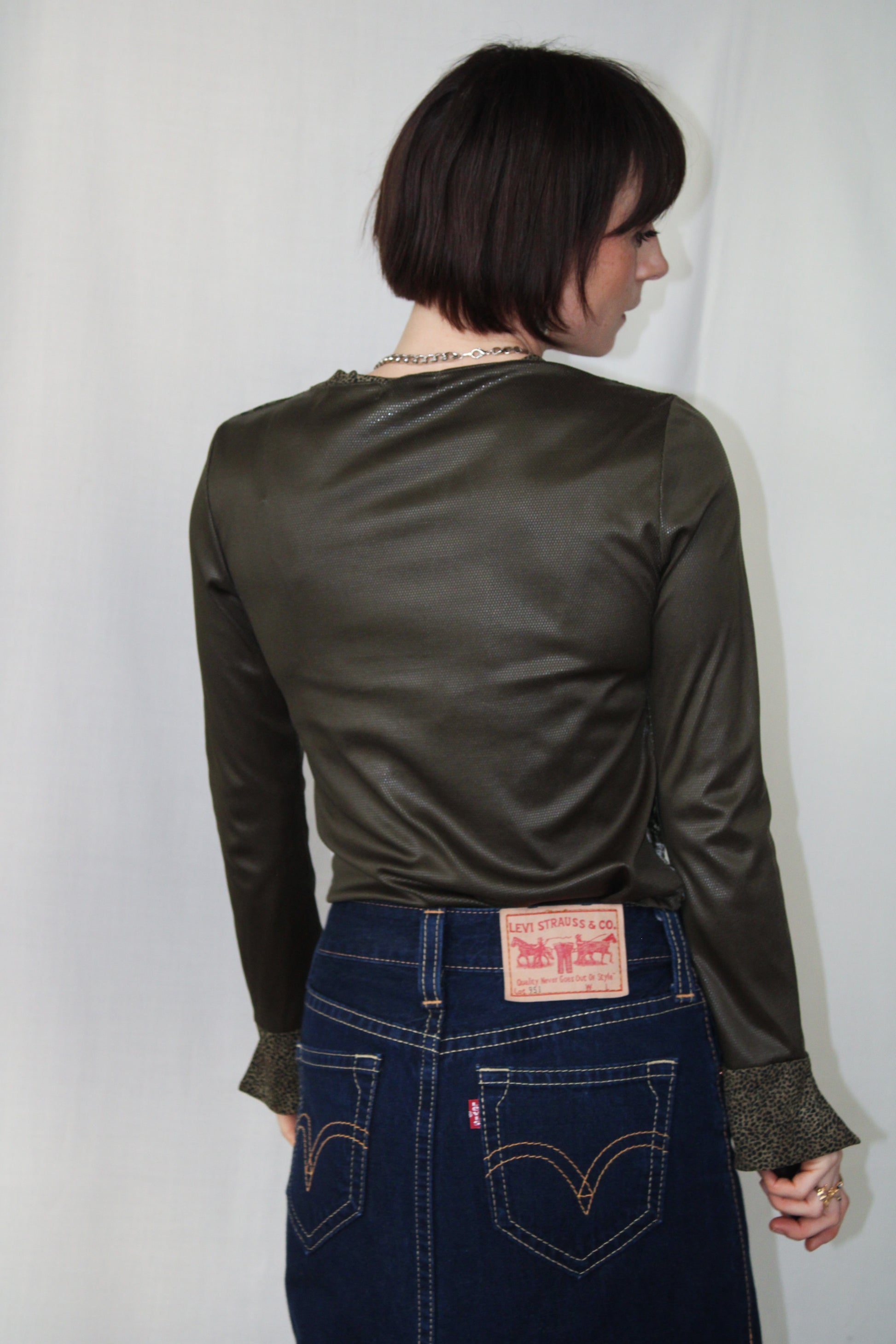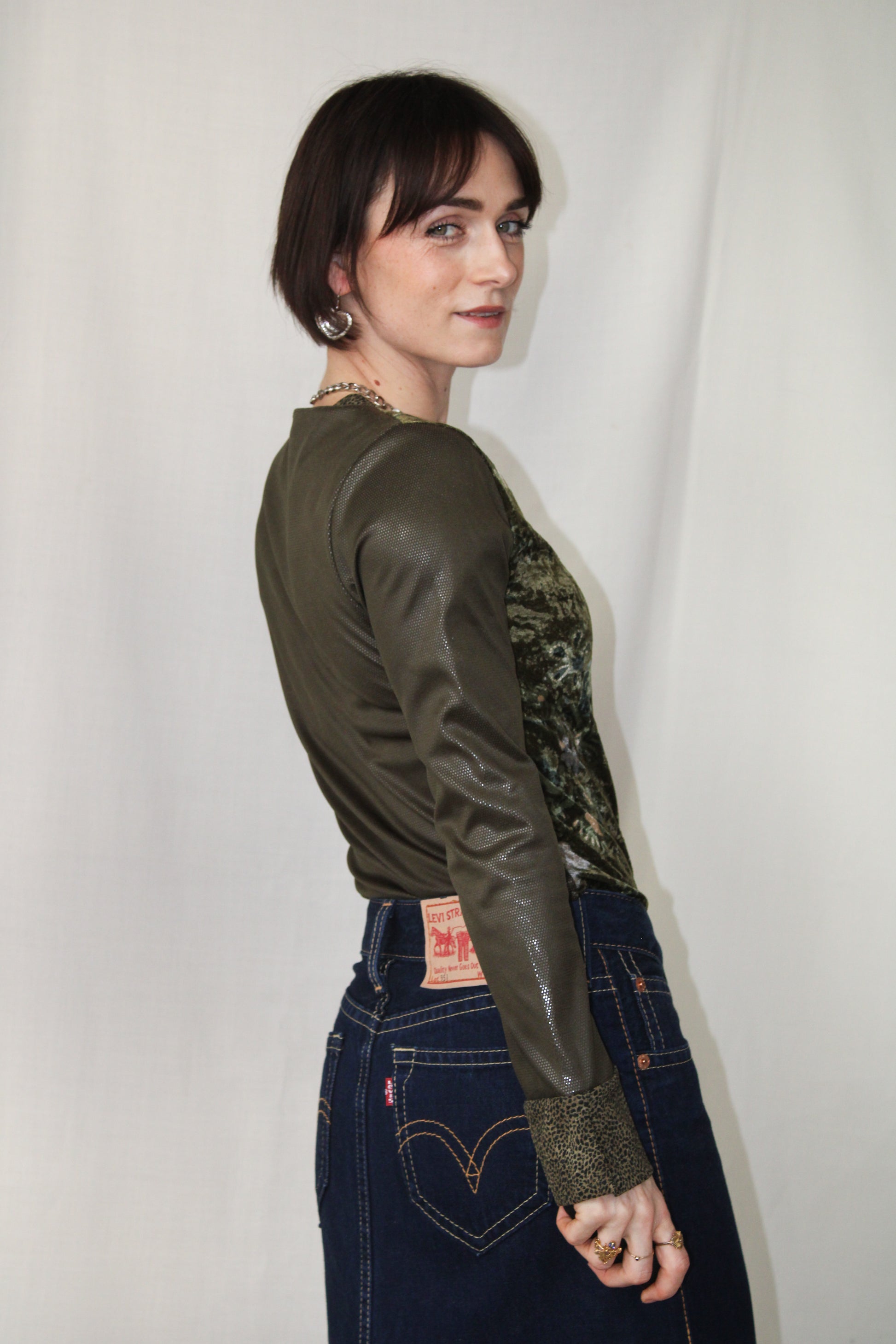 Multi fibre Penelope Collection Y2K long sleeve v-neck top. Wet look scale arms with leopard print slit cuffs and velvet floral front panel. It shouldn’t work but it does.